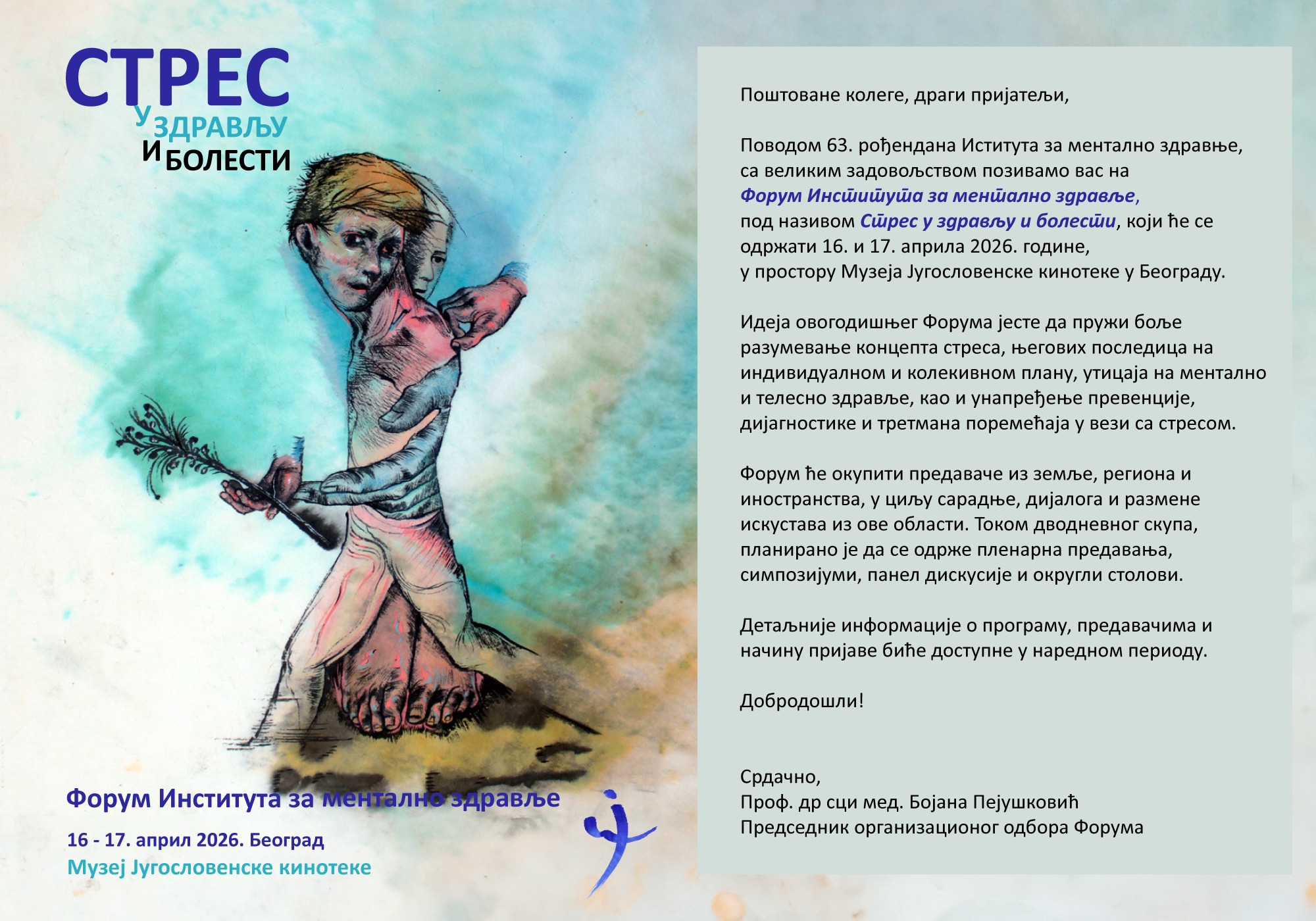 Задовољство нам је да представимо програм Форума Института за ментално здравље "Стрес у здрављу и болести" који ће се одржати 16-17 априла 2026. године у Музеју Југословенске кинотеке у Београду.