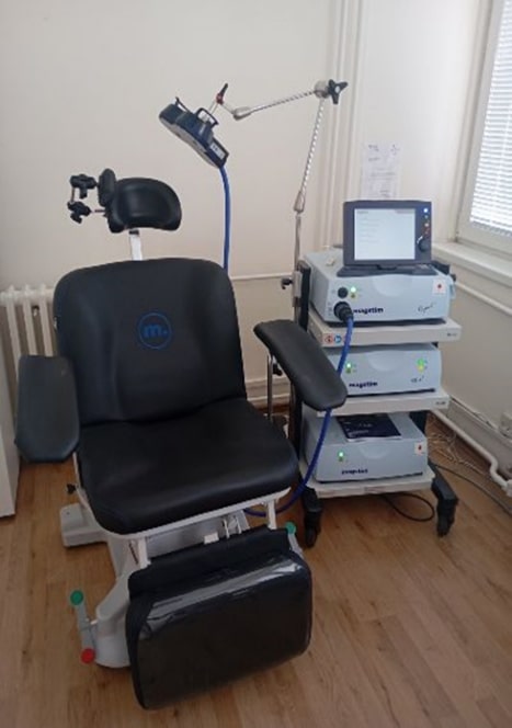 У лабораторији за Транскранијалну магнетну стимулацију примењује се ТМС у лечењу одраслих пацијената са психијатријским болестима уз помоћ апарата Rapid Therapy System (Magstim), који је Институт добио као донацију од Амбасаде Јапана у Републици Србији (Уговор о донацији, број 48/2023. од 28.11.2023. године).